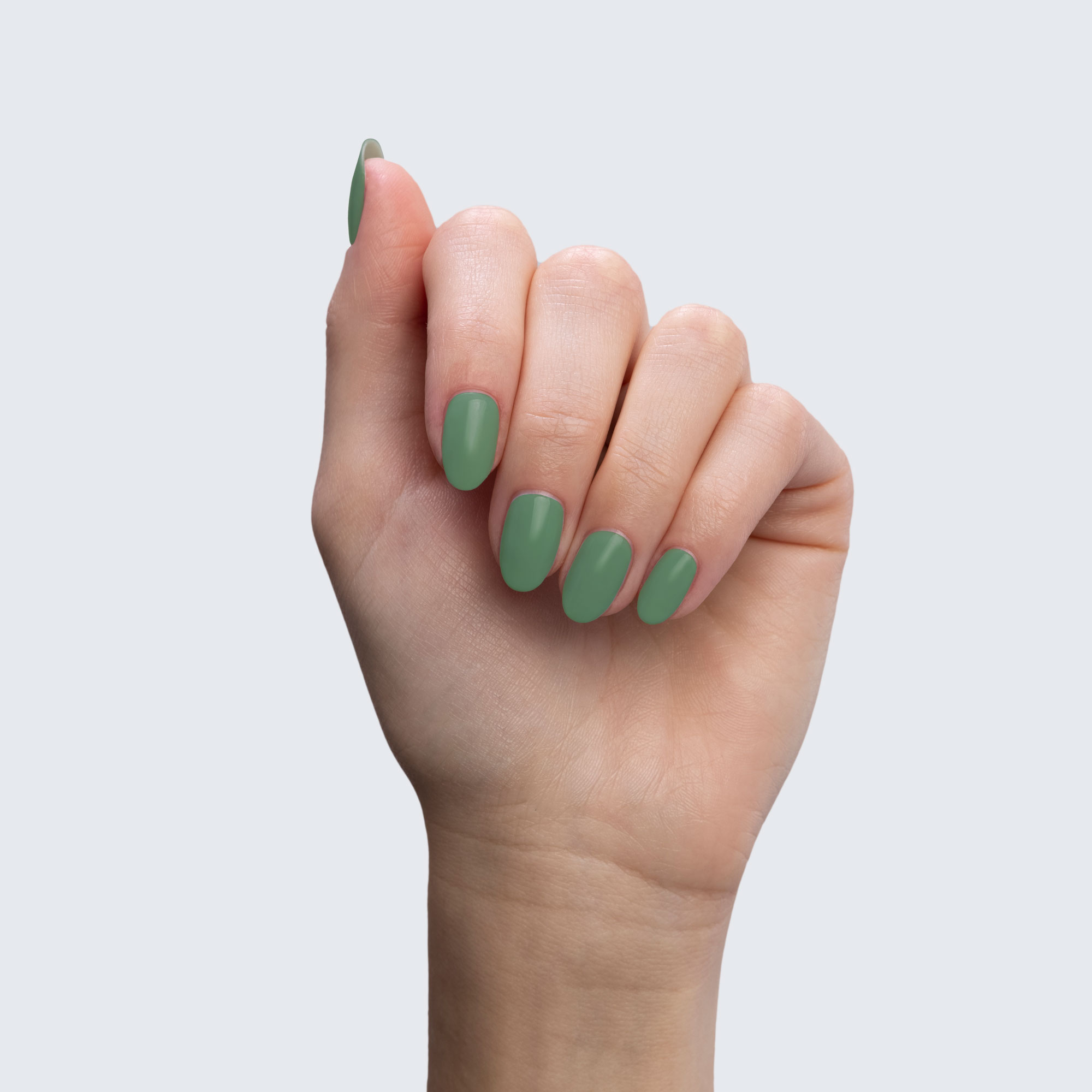 Mint green. Muted. Medium. Opaque. Warm undertone.